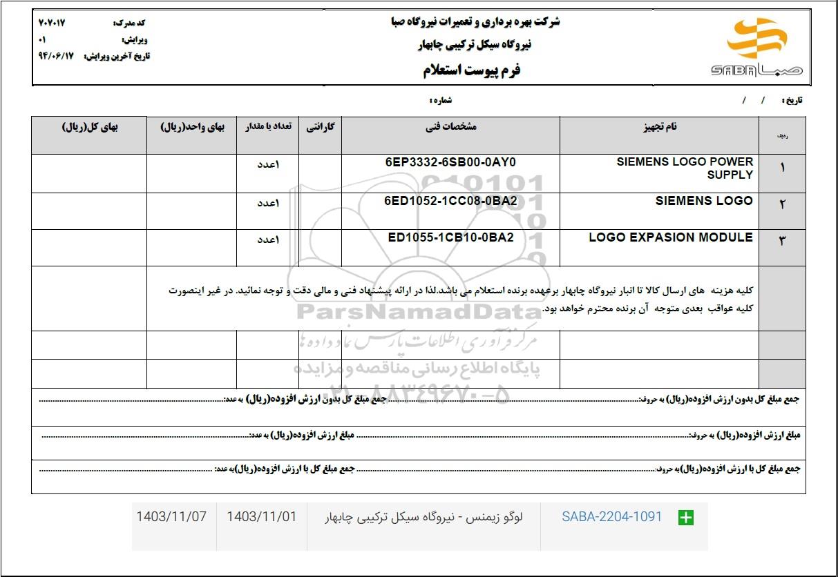 | SABA-2204-1091 | لوگو زیمنس نیروگاه سیکل ترکیبی چابهار | 1403.11.01 | 1403.11.07 |