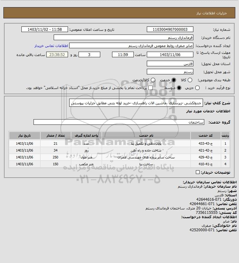 شرح کلی نیاز: جدولکشی -زیرسازی ،ماشین الات راهسازی -خرید لوله بتنی مطابق جزئیات پیوستی