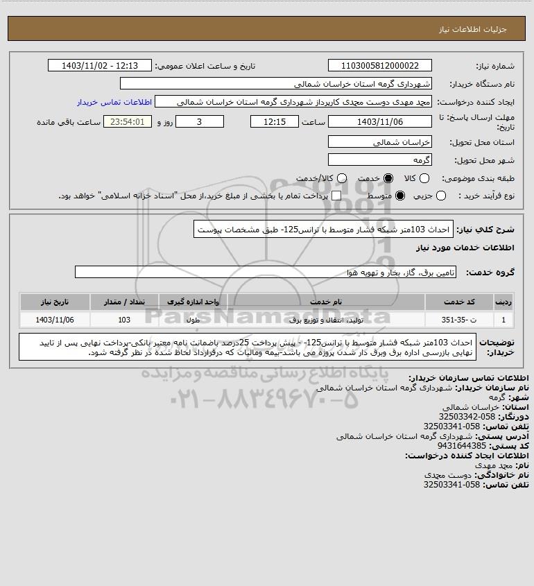 شرح کلی نیاز: احداث 103متر شبکه فشار متوسط با ترانس125- طبق مشخصات پیوست