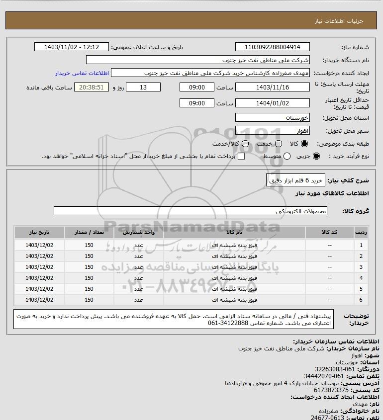 شرح کلی نیاز: خرید 6 قلم ابزار دقیق
