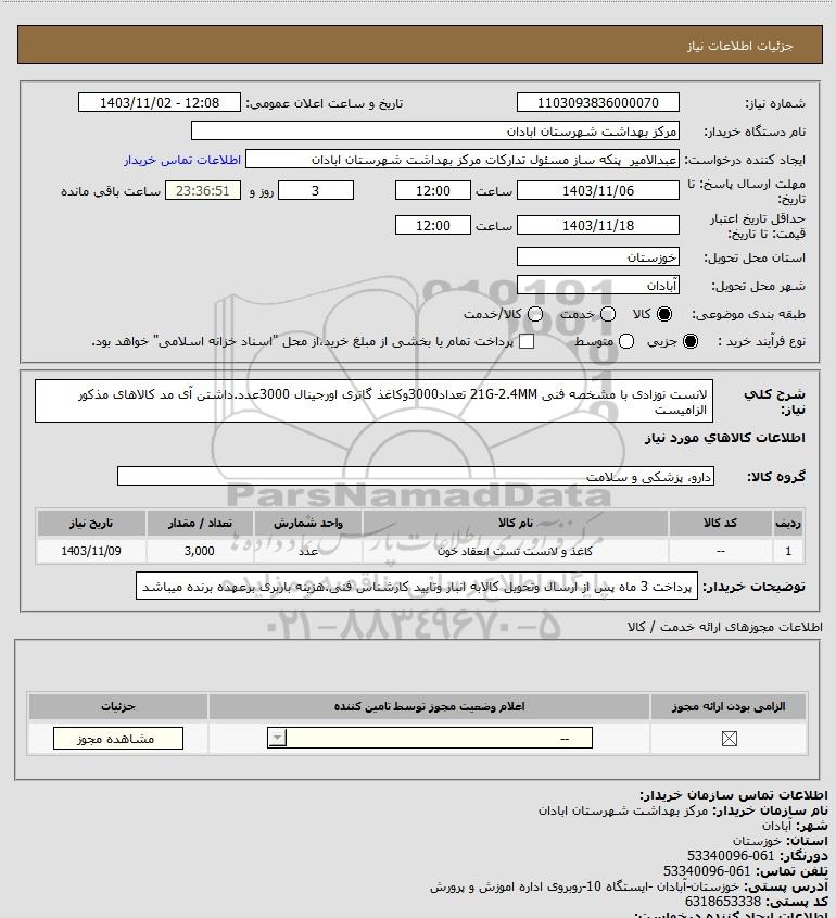 نام دستگاه خریدار:مرکز بهداشت شهرستان ابادان