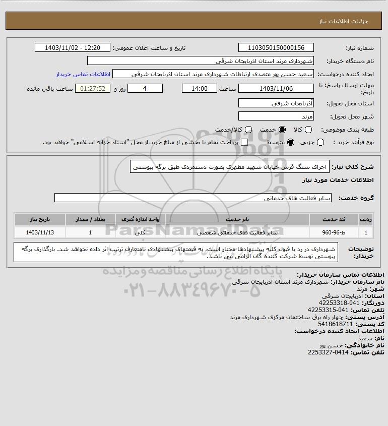 شرح کلی نیاز: اجرای سنگ فرش خیابان شهید مطهری بصورت دستمزدی طبق برگه پیوستی