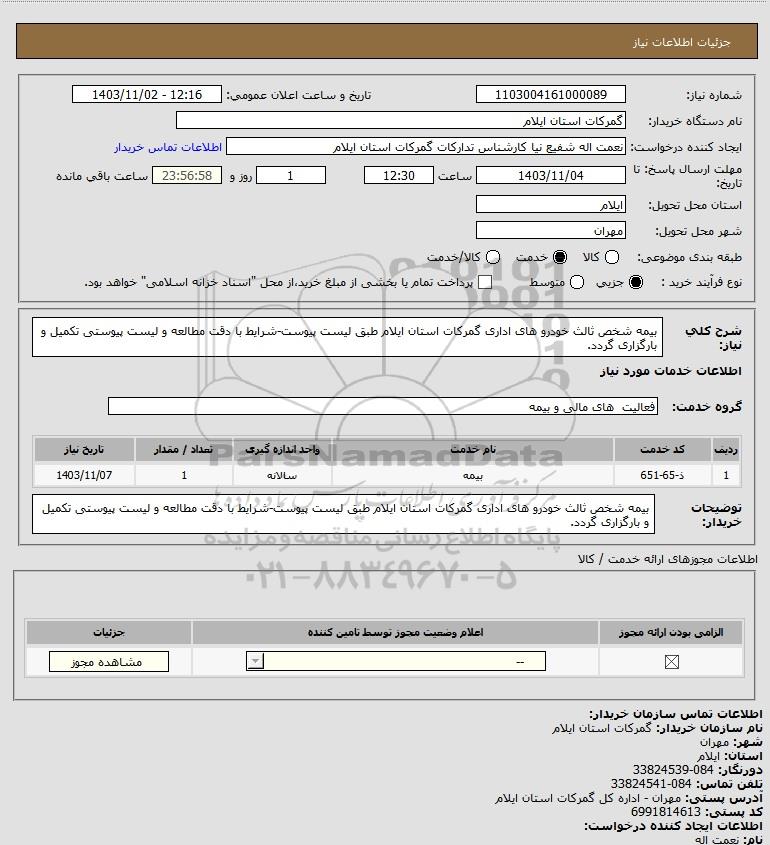 شرح کلی نیاز: بیمه شخص ثالث خودرو های اداری گمرکات استان ایلام طبق لیست پیوست-شرایط با دقت مطالعه و لیست پیوستی تکمیل و بارگزاری گردد.