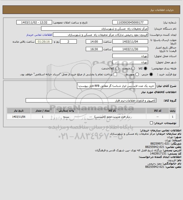 شرح کلی نیاز: خرید یک عدد لایسنس ابزار شناسا گر مطابق RFB فایل پیوست.