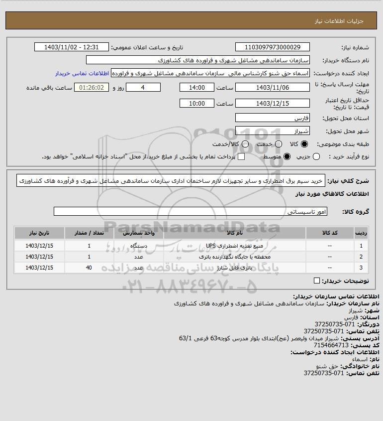 شرح کلی نیاز: خرید سیم برق اضطراری و سایر تجهیزات لازم ساختمان اداری سازمان ساماندهی مشاغل شهری و فرآورده های کشاورزی
