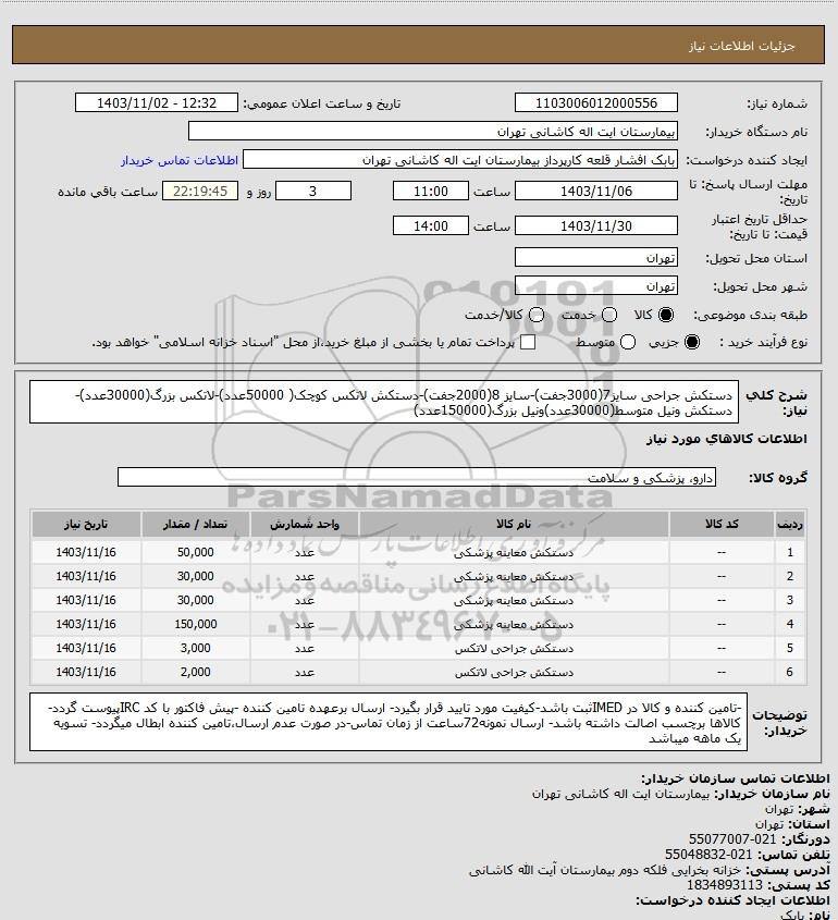 | 4 | -- | دستکش معاینه پزشکی | عدد | 150,000 | 1403/11/16 |