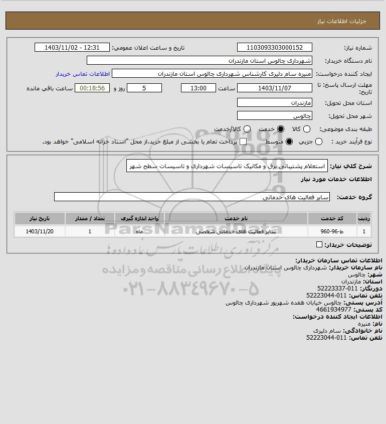 شرح کلی نیاز: استعلام پشتیبانی برق و مکانیک تاسیسات شهرداری و تاسیسات سطح شهر