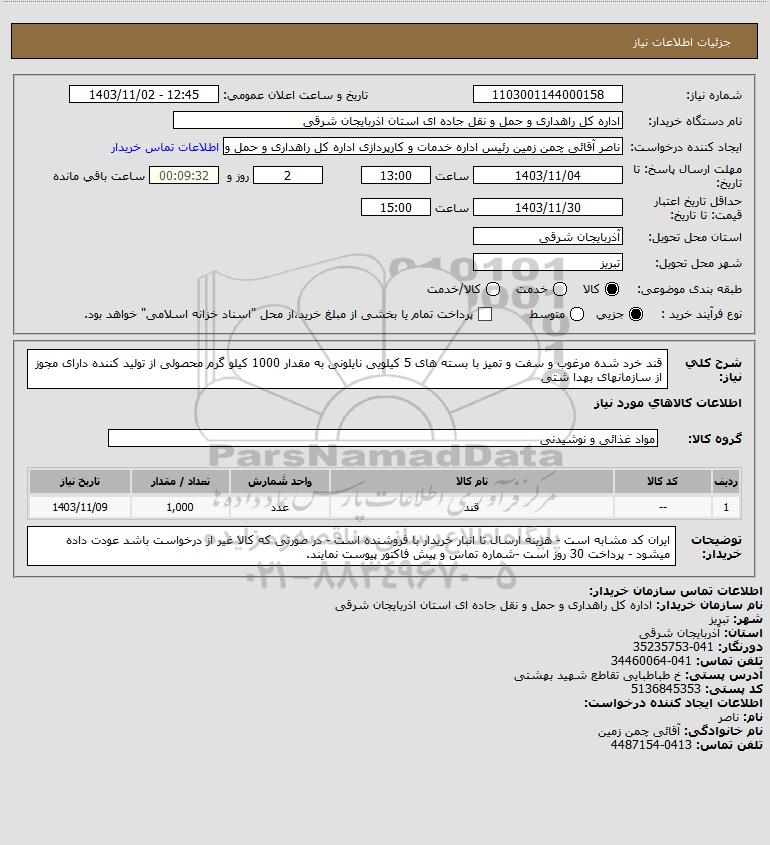 | 1 | -- | قند | عدد | 1,000 | 1403/11/09 |
