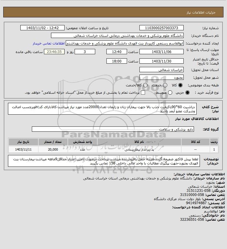 شرح کلی نیاز: دراشیت 60*90باکیفیت جذب بالا جهت بیماران زنان و زایمان تعداد20000عدد مورد نیاز میباشد-کالادارای کدircوبرچسب اصالت وشرکت عضو آیمد باشد