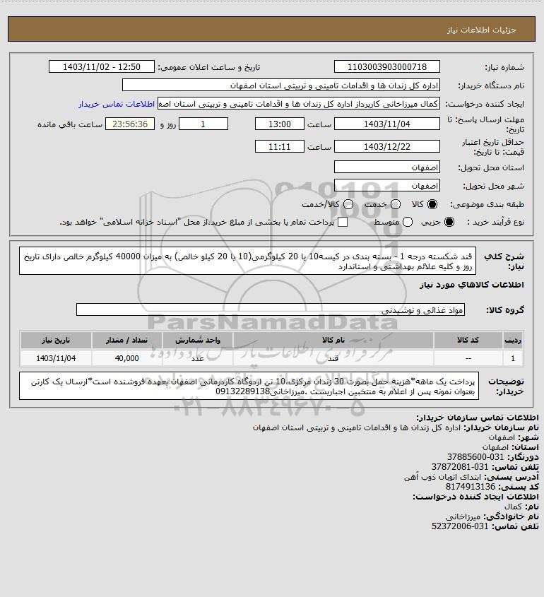 شرح کلی نیاز: قند شکسته درجه 1 - بسته بندی در کیسه10 یا 20 کیلوگرمی(10 یا 20 کیلو خالص) به میزان 40000 کیلوگرم خالص دارای تاریخ روز و کلیه علائم بهداشتی و استاندارد