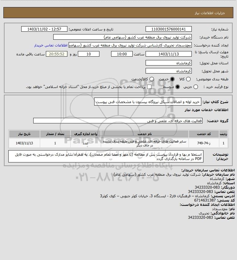شرح کلی نیاز: خرید لوله و اتصالات سیکل نیروگاه بیستون با مشخصات فنی پیوست
