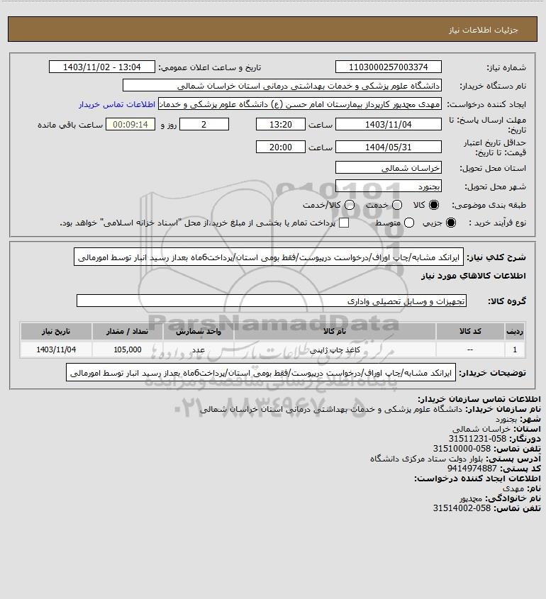 شرح کلی نیاز: ایرانکد مشابه/چاپ اوراف/درخواست درپیوست/فقط بومی استان/پرداخت6ماه بعداز رسید انبار توسط امورمالی