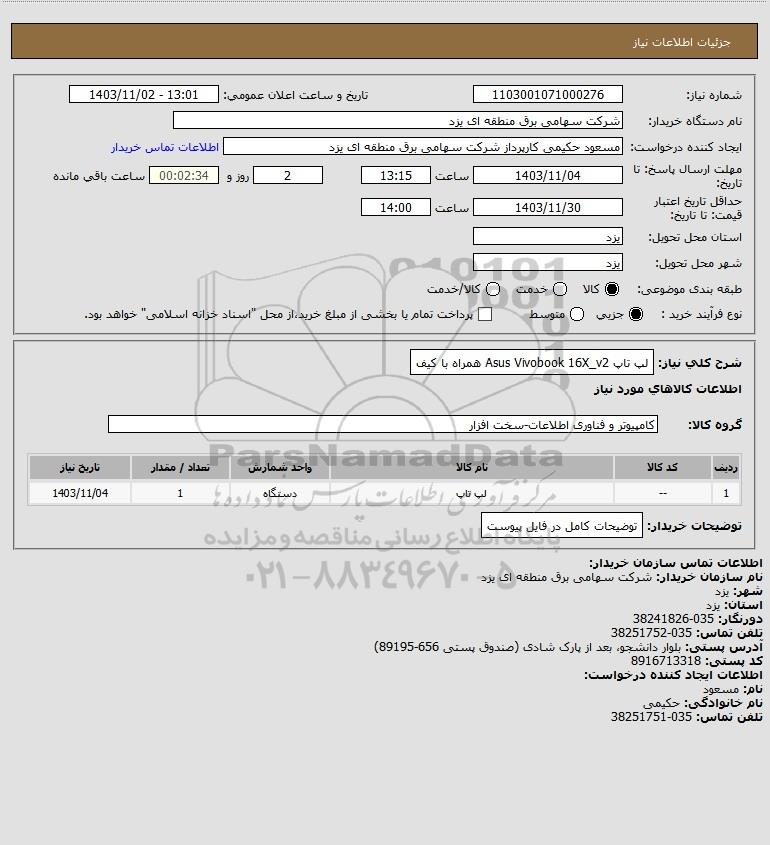 نام سازمان خریدار: شرکت سهامی برق منطقه ای یزد