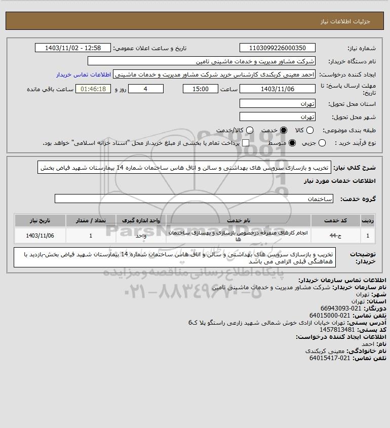 شرح کلی نیاز: تخریب و بازسازی سرویس های بهداشتی و سالن و اتاق هاس ساختمان شماره 14 بیمارستان شهید فیاض بخش