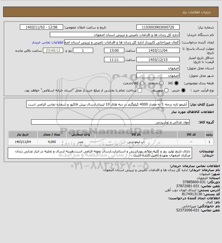 شرح کلی نیاز: آبلیمو تازه درجه 1 به مقدار 4000 کیلوگرم در دبه های 10 لیتری.ارسال پیش فاکتور و شماره تماس الزامی است