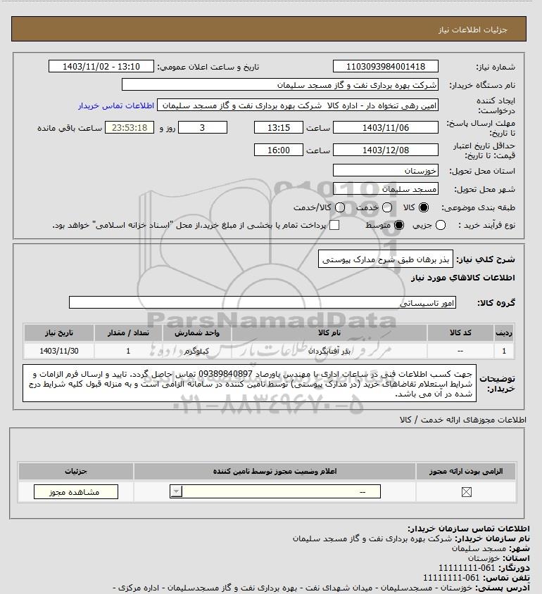 شرح کلی نیاز: بذر برهان طبق شرح مدارک پیوستی