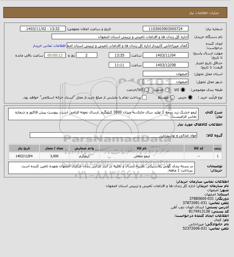 شرح کلی نیاز: لیمو خشک زرد درجه 1 تولید سال جاری.به میزان 3000 کیلوگرم .ارسال نمونه الزامی است. پیوست پیش فاکتور و شماره تماس الزامیست