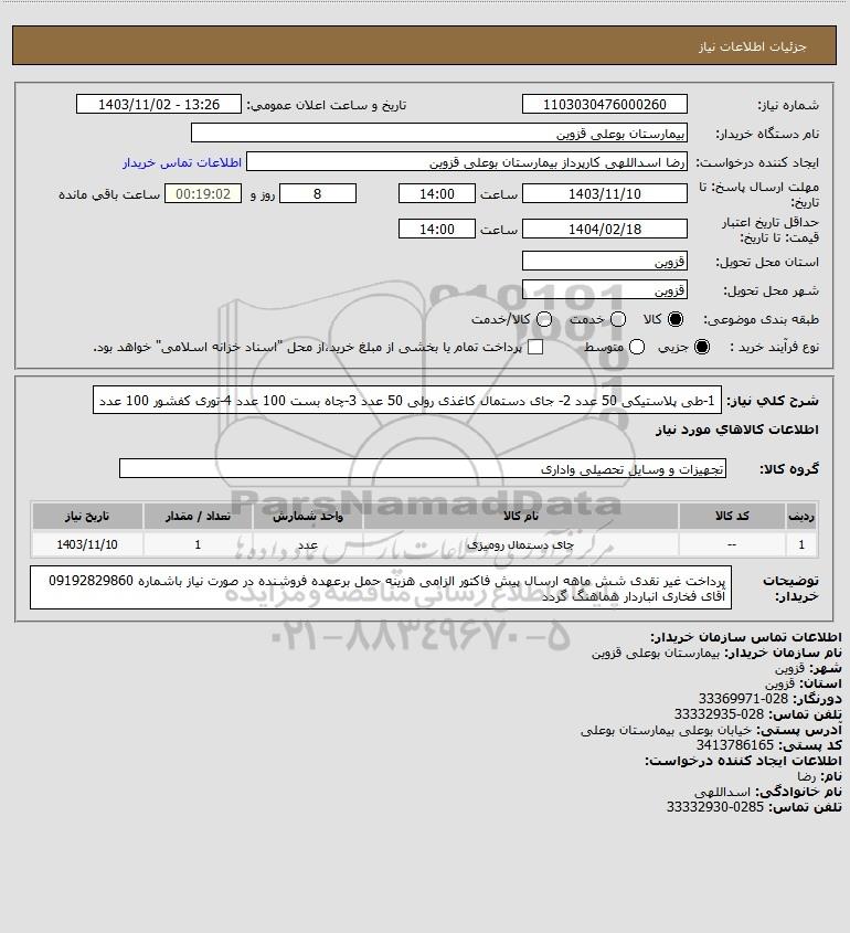 شرح کلی نیاز: 1-طی پلاستیکی 50 عدد 2- جای دستمال کاغذی رولی 50 عدد 3-چاه بست 100 عدد 4-توری کفشور 100 عدد