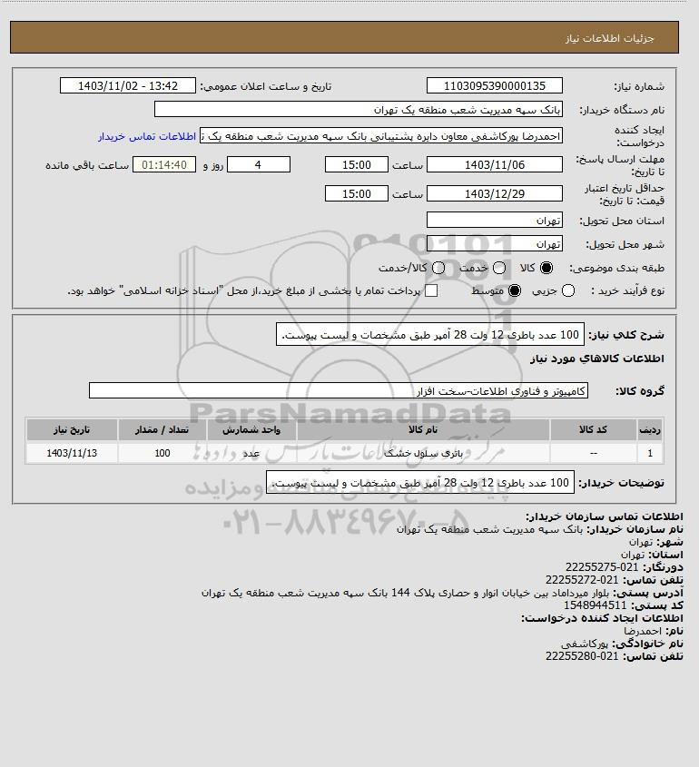 | 1 | -- | باتری سلول خشک | عدد | 100 | 1403/11/13 |