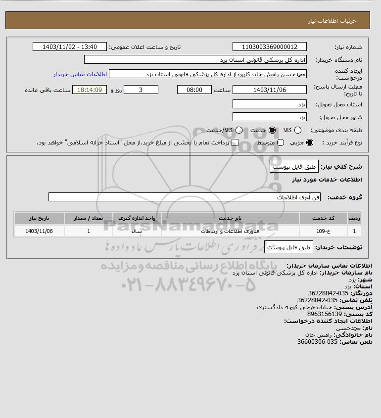 نام دستگاه خریدار:اداره کل پزشکی قانونی استان یزد