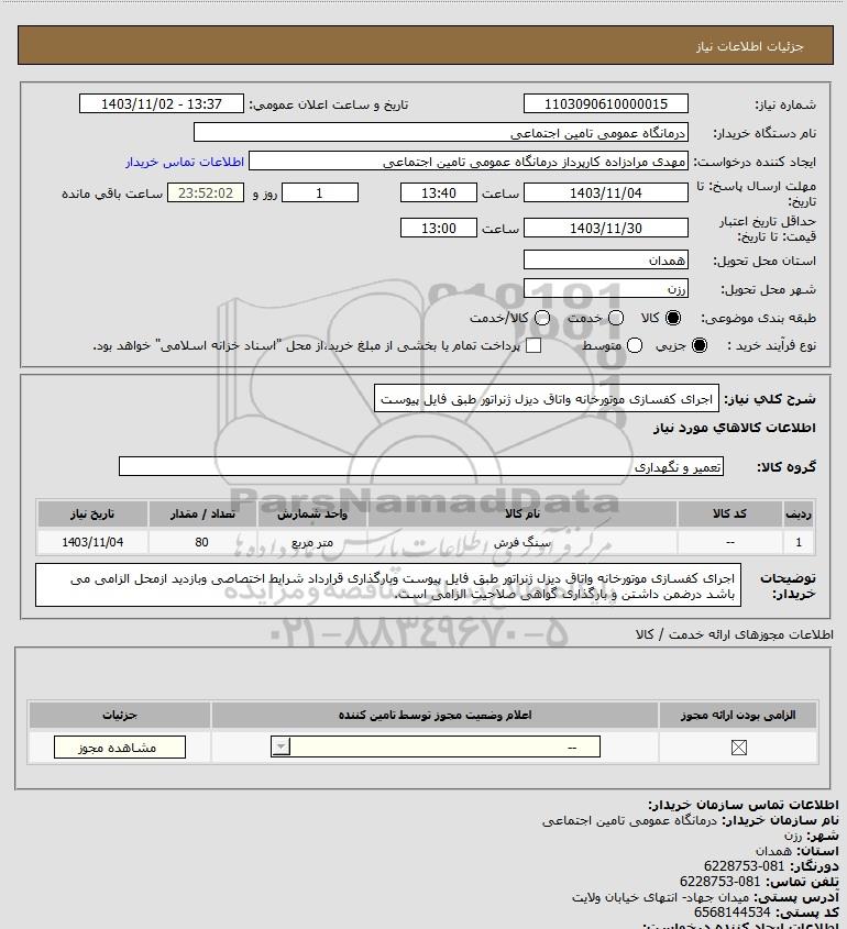 شرح کلی نیاز: اجرای کفسازی موتورخانه واتاق دیزل ژنراتور طبق فایل پیوست