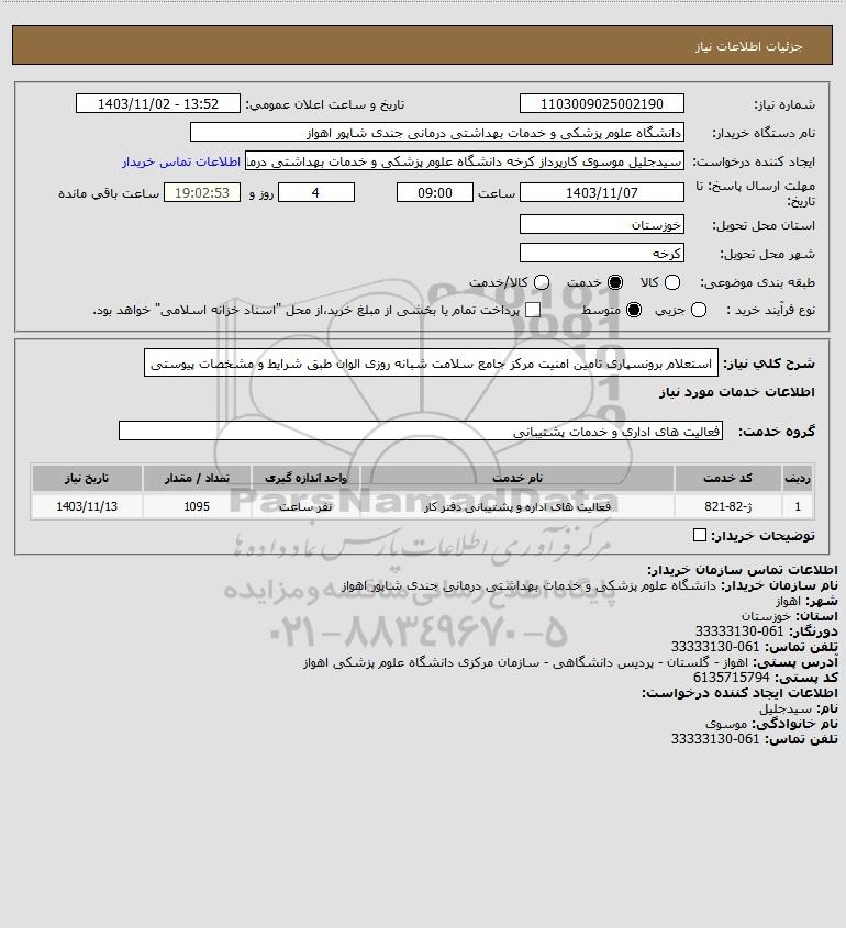 شرح کلی نیاز: استعلام برونسپاری تامین امنیت مرکز جامع سلامت شبانه روزی الوان طبق شرایط و مشخصات پیوستی