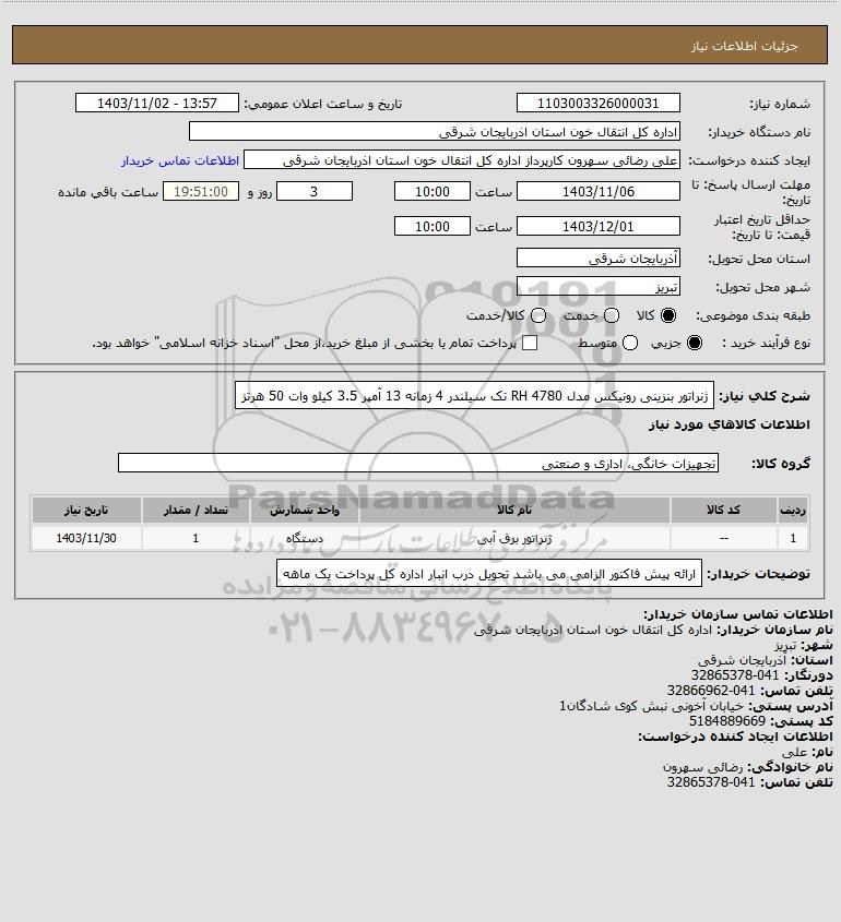 شرح کلی نیاز: ژنراتور بنزینی رونیکس مدل 4780 RH تک سیلندر 4 زمانه 13 آمپر 3.5 کیلو وات 50 هرتز