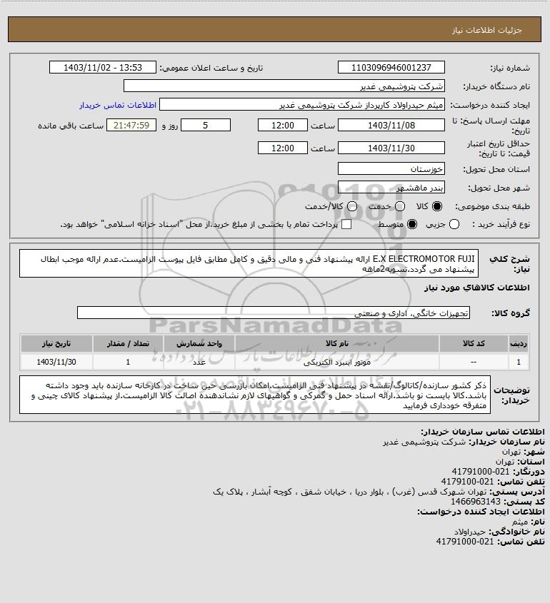 استعلام بها و موضوع استعلام استعلام E.X ELECTROMOTOR FUJI ارائه پیشنهاد فنی و مالی دقیق و کامل مطابق فایل پیوست الزامیست.عدم ارائه موجب ابطال پیشنهاد می گردد.تسویه2ماهه به اطلاع کلیه شرکتها و افراد متخصص واجد شرایط میرساند، آگهی گذار در نظر دارد از طریق استعلام بها، نسبت به انتخاب و دریافت پیشنهادات اقدام نماید. این استعلام با کد آگهی ثبت شده در سامانه خبرگزاری پارس نماد : 8567534 منتشر شده است. مشخصات استعلام : تاریخ شروع استعلام: 1403/11/02 آخرین مهلت ارسال پیشنهاد قیمت : 1403/11/08 و محل اجرای پروژه : استان خوزستان میباشد. استعلام قیمت مورد درخواست : استعلام E.X ELECTROMOTOR FUJI ارائه پیشنهاد فنی و مالی دقیق و کامل مطابق فایل پیوست الزامیست.عدم ارائه موجب ابطال پیشنهاد می گردد.تسویه2ماهه با دستهبندیهای تخصصی و گروه های مرتبط : الکتروموتور و پمپ های شناور, تجهیزات نفت و گاز, تجهیزات برق و الکترونیک, استعلام اطلاع رسانی میگردد.