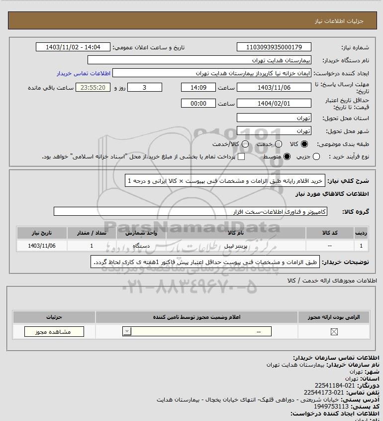 نام دستگاه خریدار:بیمارستان هدایت تهران
