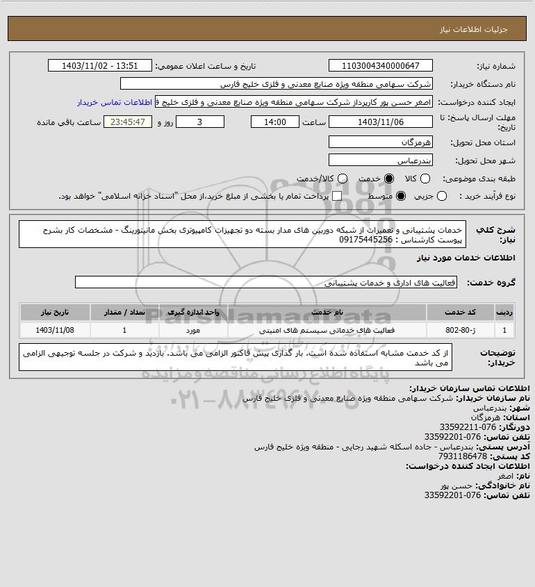 شرح کلی نیاز: خدمات پشتیبانی و تعمیرات از شبکه دوربین های مدار بسته دو تجهیزات کامپیوتری بخش مانیتورینگ - مشخصات کار بشرح پیوست کارشناس : 09175445256