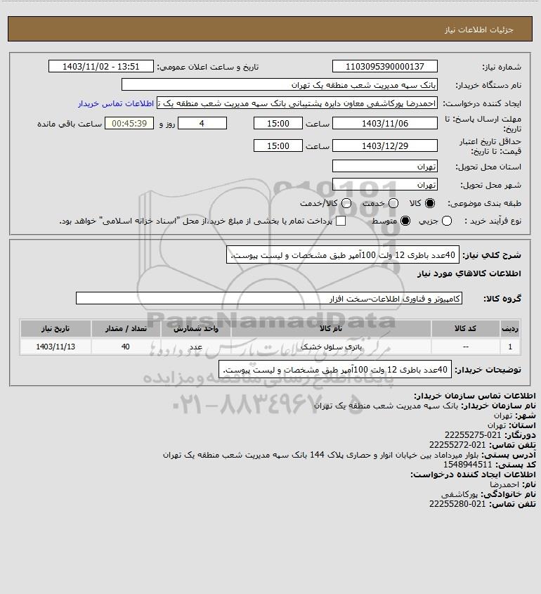 | 1 | -- | باتری سلول خشک | عدد | 40 | 1403/11/13 |