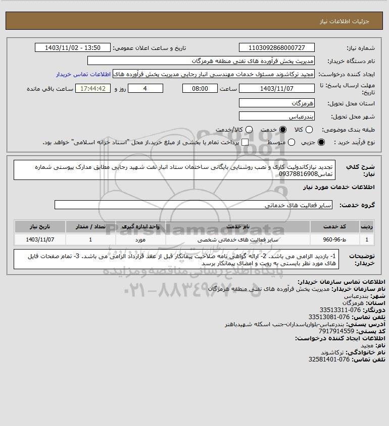 شرح کلی نیاز: تجدید نیازکاندوئیت کاری و نصب روشنایی بایگانی ساختمان ستاد انبار نفت شهید رجایی مطابق مدارک پیوستی شماره تماس09378816908