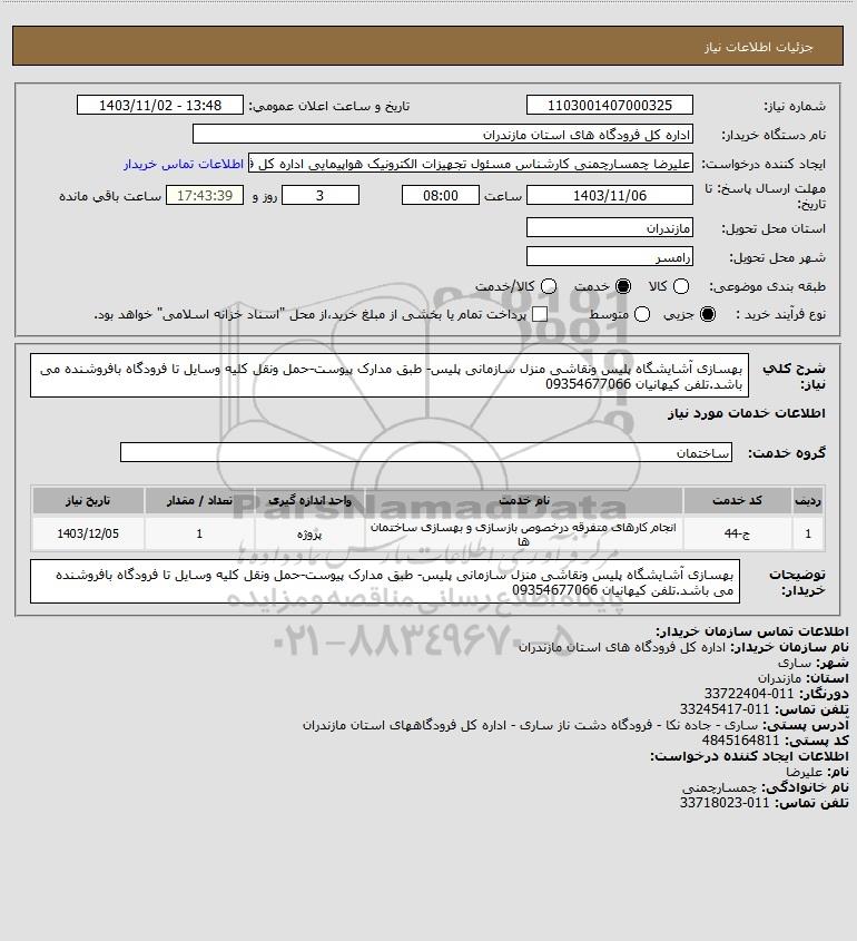 توضیحات خریدار:بهسازی آشایشگاه پلیس ونقاشی منزل سازمانی پلیس- طبق مدارک پیوست-حمل ونقل کلیه وسایل تا فرودگاه بافروشنده می باشد.تلفن کیهانیان 09354677066