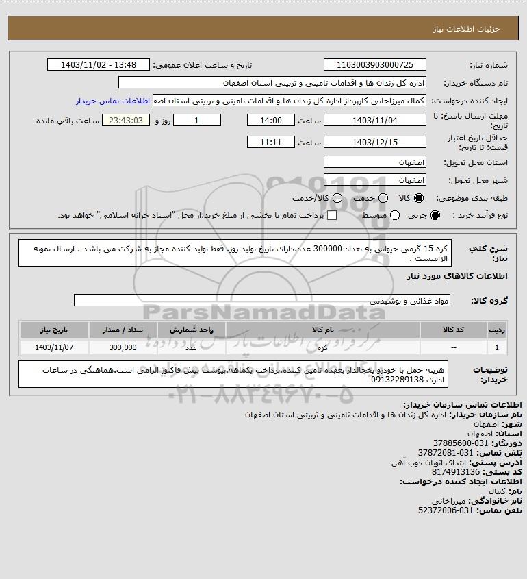 شرح کلی نیاز: کره 15 گرمی حیوانی به تعداد 300000 عدد.دارای تاریخ تولید روز. فقط تولید کننده مجاز به شرکت می باشد . ارسال نمونه الزامیست .