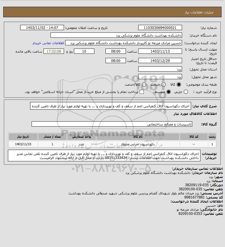 شرح کلی نیاز: اجرای دکوراسیون اتاق کنفرانس اعم از سقف و کف و نورپردازی و ... با تهیه لوازم مورد نیاز از طرف تامین کننده