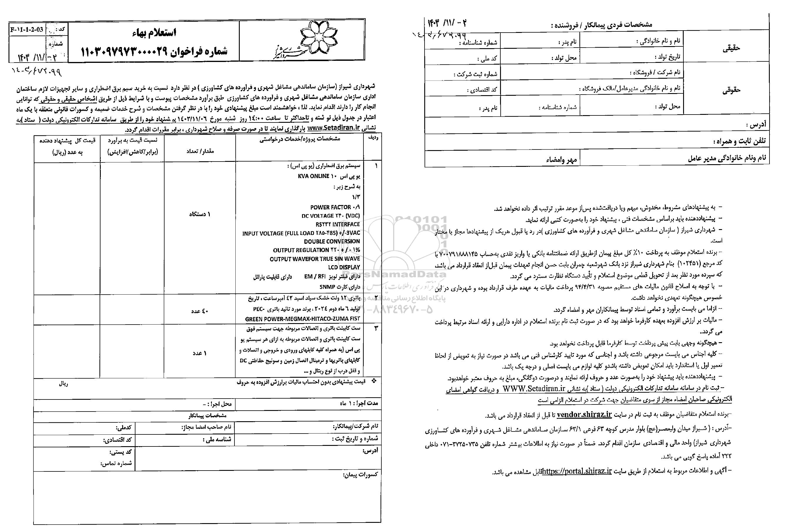 شهرداری شیراز (سازمان ساماندهی مشاغل شهری و فرآورده های کشاورزی) در نظر دارد نسبت به خرید سیم برق اضطراری و سایر تجهیزات لازم ساختمان اداری سازمان ساماندهی مشاغل شهری و فرآورده های کشاورزی طبق برآورد مشخصات پیوست و با شرایط ذیل از طریق اشخاص حقیقی و حقوقی که توانایی انجام کار را دارند اقدام نماید. لذا خواهشمند است مبلغ پیشنهادی خود را با در نظر گرفتن مشخصات و شرح خدمات ضمیمه و کسورات قانونی متعلقه با یک ماه اعتبار د رجدول ذیل نوشته و تا حداکثر تا ساعت 14 روز شنبه مورخ 1402.11.6 پیشنهاد خود را از طریق سامنه تدارکات الکترونیکی دولت (ستاد) به نشانی ستاد ایران بارگذاری نمایند تا در صورت صرفه و صلاح شهرداری، برابر مقررات اقدام گردد.