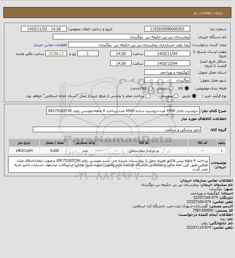 | 1 | -- | پد زیرانداز بیمارستانی | عدد | 9,000 | 1403/11/04 |