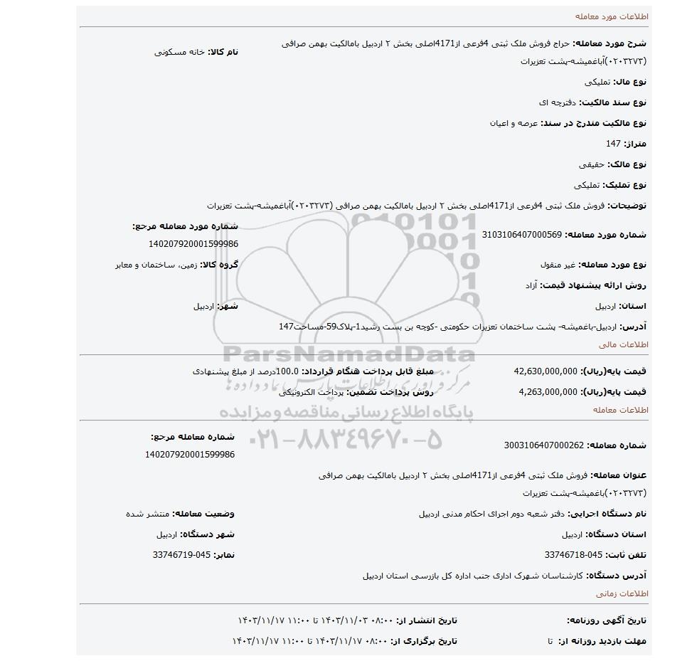 مزایده فروش ملک ثبتی 4فرعی از4171اصلی بخش ۲ اردبیل بامالکیت بهمن صرافی (۰۲۰۳۲۷۳)آباغمیشه-پشت تعزیرات, مزایده، فروش ملک ثبتی 4فرعی از4171اصلی بخش ۲ اردبیل بامالکیت بهمن صرافی (۰۲۰۳۲۷۳)آباغمیشه-پشت تعزیرات