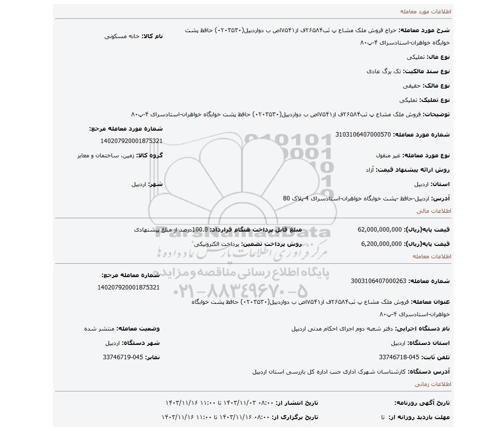 عنوان معامله: فروش ملک مشاع پ ثب۲۶۵۸۴ف از۷۵۴۱اص ب دواردبیل(۰۲۰۳۵۳۰) حافظ پشت خوابگاه خواهران-استادسرای ۴-پ۸۰