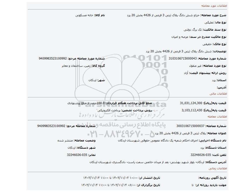 | عنوان معامله: پلاک ثبتی 3 فرعی از 4426 بخش 20 یزد | ||