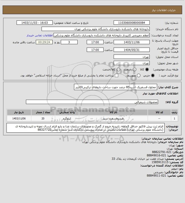 شرح کلی نیاز: محلول فسفریک اسید85 درصد جهت ساخت داروهای ترکیبی20لیتر