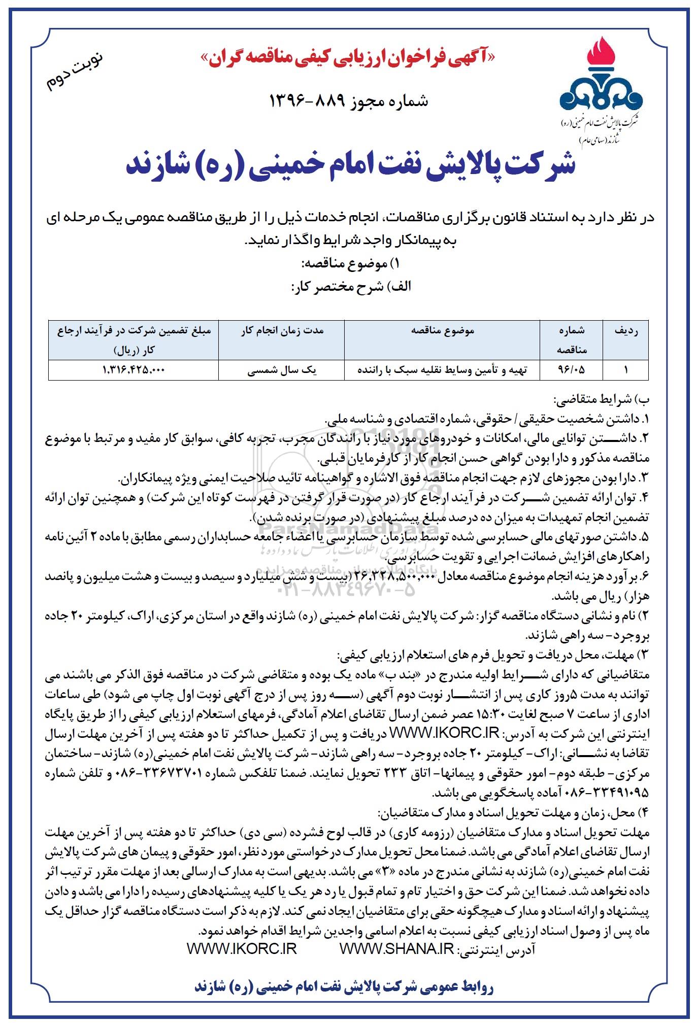 متقاضیانی که دارای شرایط اولیه مندرج در بند ب بوده و م تقاضی شرکت در مناقصه فوق الذکر می باشند می توانند به مدت 5 روز کاری پس از انتشار نوبت دوم آگهی (سه روز پس از درج آگهی نوبت اول چاپ می شود) طی ساعات اداری از ساعت 7 صبح لغایت 15:30 عصر ضمن ارسال تقاضای اعلام آمادگی، فرمهای استعلام ارزیابی کیفی را از طریق پایگاه اینترنتی این شرکت به آدرس www.ikorc.ir دریافت و پس از تکمیل حداکثر تا دو هفته پس از آخرین مهلت ارسال تقاضا به نشانی: اراک، کیلومتر 20 جاده بروجرد، سه راهی شازند، شرکت پالایش نفت امام خمینی (ره) شازند، ساختمان مرکزی، طبقه دوم، امور حقوقی و پیمانها اتاق 233 تحویل نمایند ضمناً تلفکس شماره 33673701-086 و تلفن شماره 33491095 آماده پاسخگویی می با شد