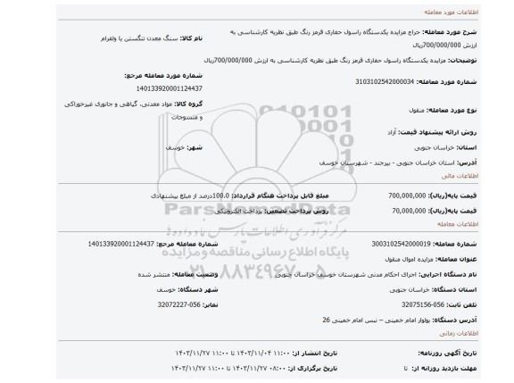 | شرح مورد معامله: حراج مزایده یکدستگاه راسول حفاری قرمز رنگ طبق نظریه کارشناسی به ارزش 700/000/000ریال | نام کالا: سنگ معدن تنگستن یا ولفرام | |