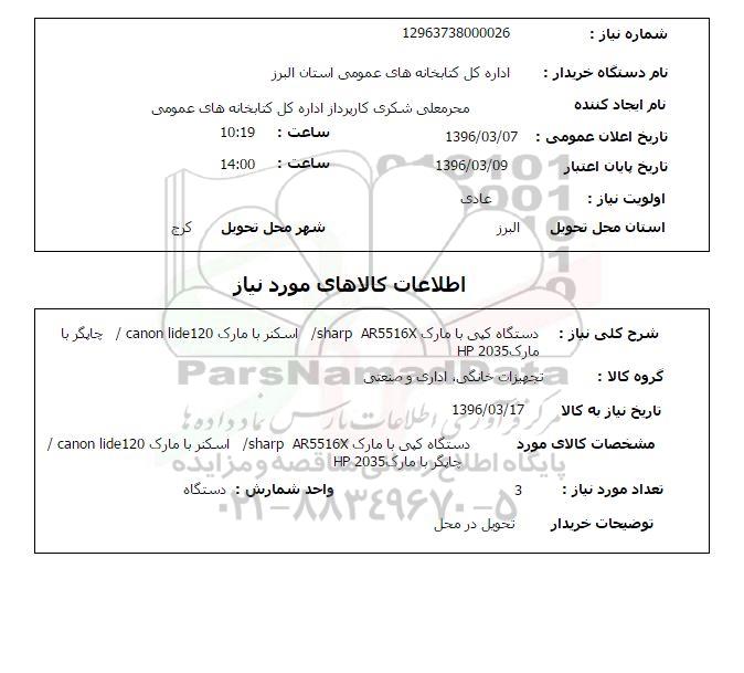 شرح کلی نیاز : دستگاه کپی با مارک sharp AR5516X اسکنر با مارک canon lide120 چاپگر با مارک HP 2035