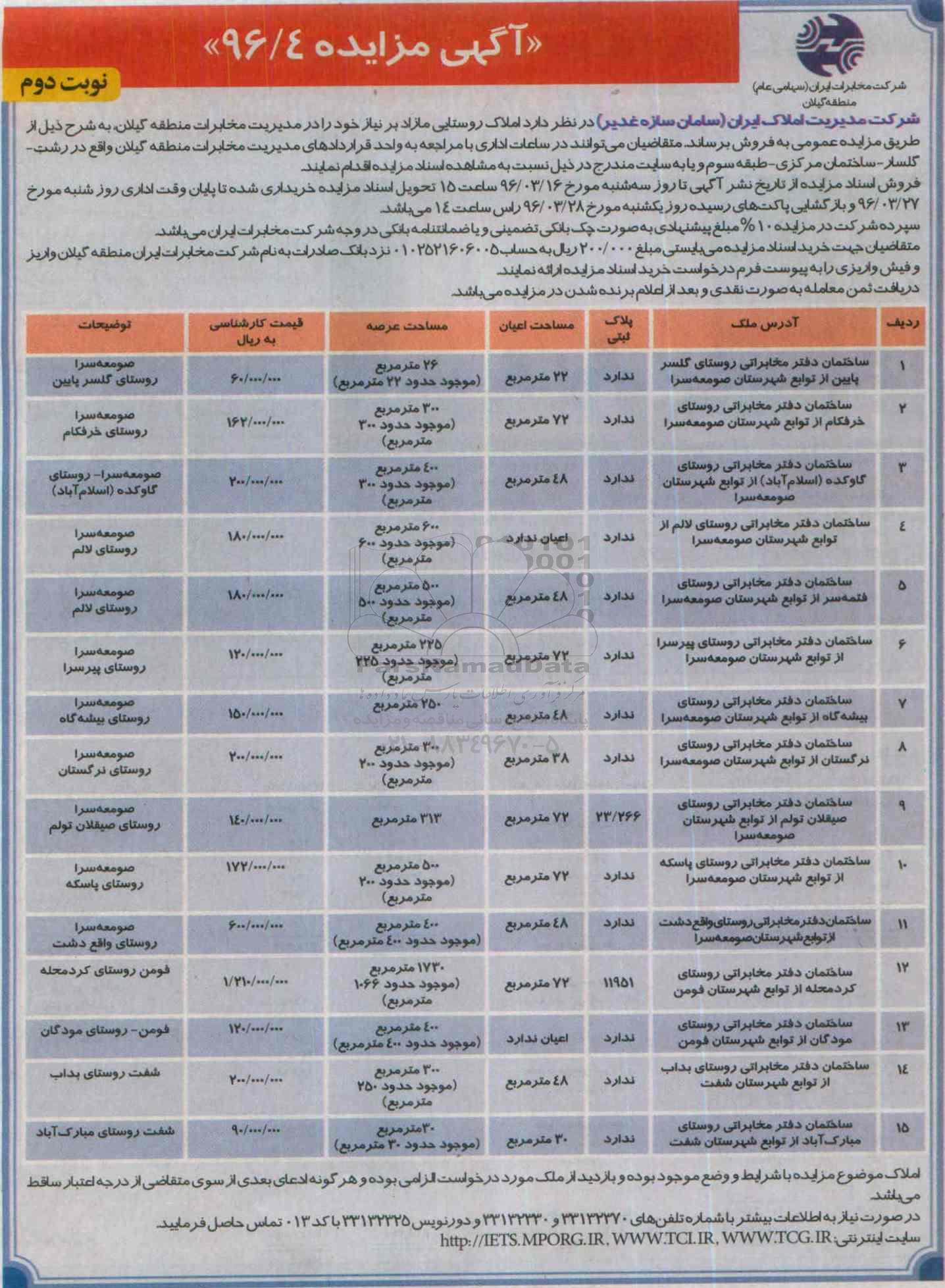 مزایده عمومی مزایده فروش املاک روستایی مازاد بر نیاز نوبت دوم برگزار میگردد. از کلیه افراد متخصص و شرکتهای واجد شرایط دعوت به عمل میآید تا در این مزایده با کد خبرگزاری پارس نماد : 858251 شرکت نمایند تاریخ شروع مزایده : 1396/03/08 مهلت شرکت در مزایده: تا پایان روز 1396/03/16 مکان برگزاری اموال واگذاری استانهای گیلان و دستهبندیهای مربوط به این حراجی املاک و زمین میباشد.