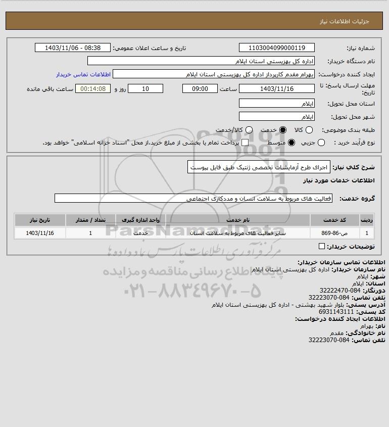 شرح کلی نیاز: اجرای طرح آزمایشات تخصصی ژنتیک طبق فایل پیوست