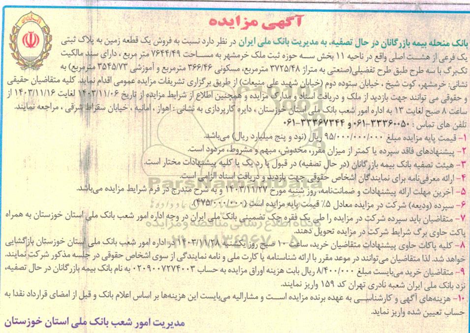 بانک منحله بیمه بازرگانان در حال تصفیه به مدیریت بانک ملی ایران در نظر دارد نسبت به فروش یک قطعه زمین به پلاک ثبتی یک فرعی از هشت اصلی واقع در ناحیه 11 بخش سه حوزه ثبت ملک خرمشهر به مساحت 7644.49 متر مربع ، دارای سند مالکیت تک برگ با سه طرح طبق طرح تفضیلی صنعتی به متراژ 3725.48 متر مربع مسکونی 366.46 متر مربع و آموزشی 3545.73 متر مربع) به نشانی: خرمشهر کوت شیخ ، خیابان ستوده دوم خیابان شهید علی منیعات از طریق برگزاری تشریفات مزایده عمومی اقدام نماید. کلیه متقاضیان حقیقی و حقوقی میتوانند جهت بازدید از ملک و دریافت اسناد و مدارک مزایده و همچنین اطلاع از شرایط مزایده از تاریخ 1403.11.06 لغایت 1403.11.16 از ساعت 8 صبح لغایت 13 به اداره امور شعب بانک ملی استان خوزستان ، دایره کارپردازی به نشانی اهواز ، امانیه ، خیابان سقراط شرقی ، مراجعه نمایند.