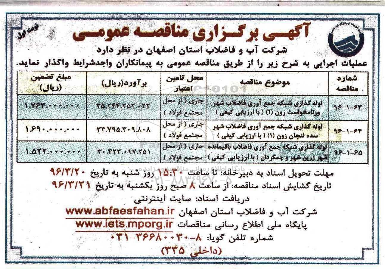 شرکت آب و فاضلاب استان اصفهان در نظر دارد عملیات اجرایی به شرح زیر را از طریق مناقصه عمومی به پیمانکاران واجدشرایط واگذار نماید.
