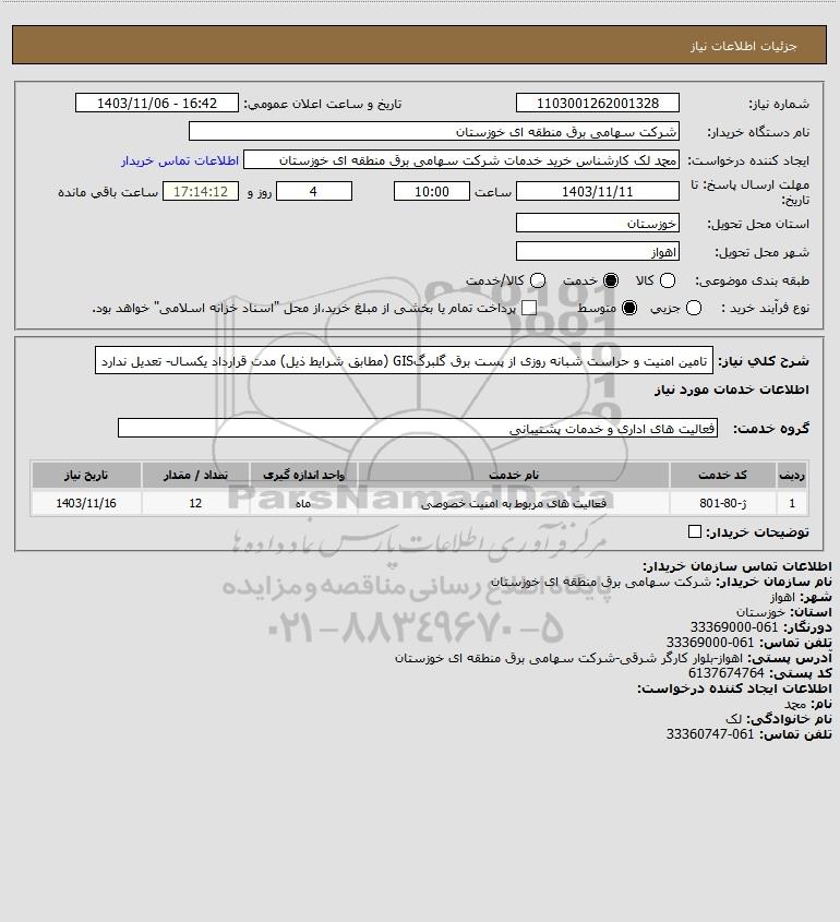 شرح کلی نیاز: تامین امنیت و حراست شبانه روزی از پست برق گلبرگGIS (مطابق شرایط ذیل)