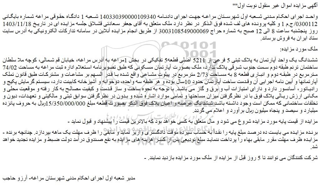 واحد اجرای احکام مدنی شعبه اول شهرستان مراغه جهت اجرای دادنامه 140330390000109340 شعبه 1 دادگاه حقوقی مراغه شماره بایگانی 0300112/ج.م 1 و کلیه پرونده های لف شده فوق الذکر در نظر دارد ملک متعلق به آقای جعفر سعادتی قشلاق جلسه مزایده ای در تاریخ 1403/11/18 روز پنجشنبه ساعت 8 الی 12 صبح به شماره حراج 3003108549000069 از طریق انجام مزایده آنلاین در سامانه تدارکات الکترونیکی به آدرس سایت ستاد ایران به فروش برساند.